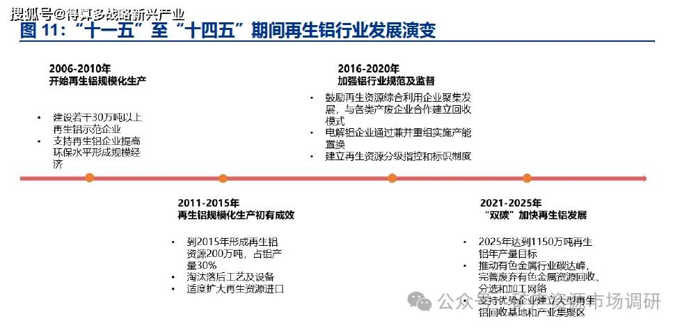 支持政策持续发布。在环境保护及节约能源背景推动下,循环经济逐渐发展成为我国重要的经济形式,自 2006 年“十一五”时期开启以来,全国人大、中央、国务院、发改委以及工业和信息化部针对再生资源综合利用颁布一系列政策,大力支持再生铝行业发展。随着再生铝产业规模化、装备技术现代化速度不断加快,再生铝有望替代电解铝成为我国铝消费的主要供应来源。“十一五”至“十四五”期间,我国涉及再生铝行业的国家政策大体上经历了四个演变发展阶段。