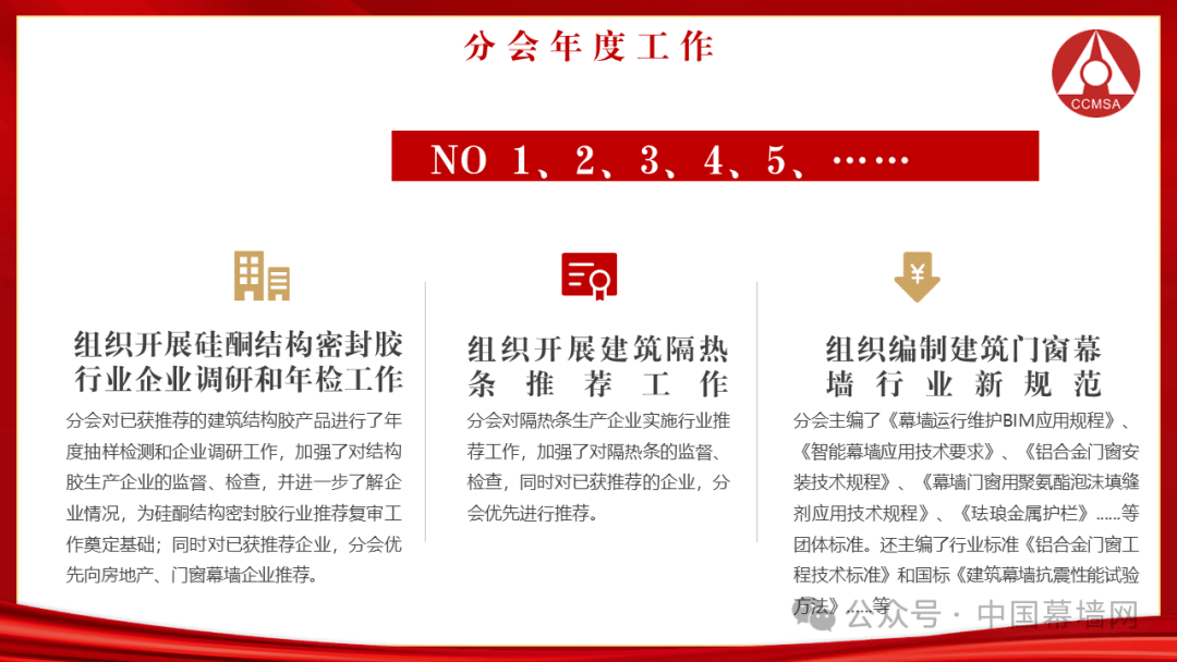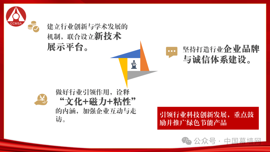 2024年分会积极开展铝门窗幕墙行业的全面工作,坚持高质量发展,紧抓时代特色,以行业企业需求为核心,以平台性、公允性、公开性为推动,开创中国铝门窗幕墙行业现代化的新局面。坚定不移的以“二十大”精神为指导,实施四轮驱动策略,推动行业高质量发展。根据国家总体方向,用“保险服务、双碳指导、绿色认证和清洁能源”四项举措,把全行业推向高质量发展的快速道。