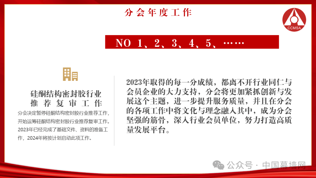 2024年继续筹备硅酮结构密封胶行业推荐复审工作,制定计划、方案,统筹安排,进一步规范硅酮结构密封胶行业,为推动行业高质量发展贡献力量。