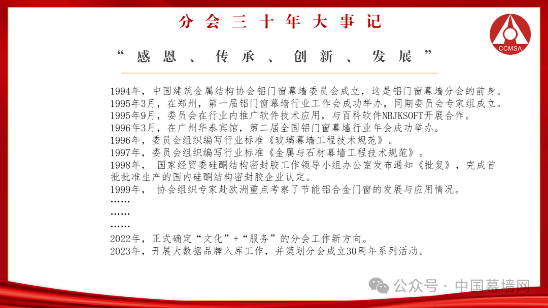 2024年铝门窗幕墙分会成立30年了,这既是一个时间节点,也是一个传承发展的阶段,因此决定举办系列庆祝活动。对此分会制定了庆祝活动的计划和方案,正在按部就班的进行筹备工作。